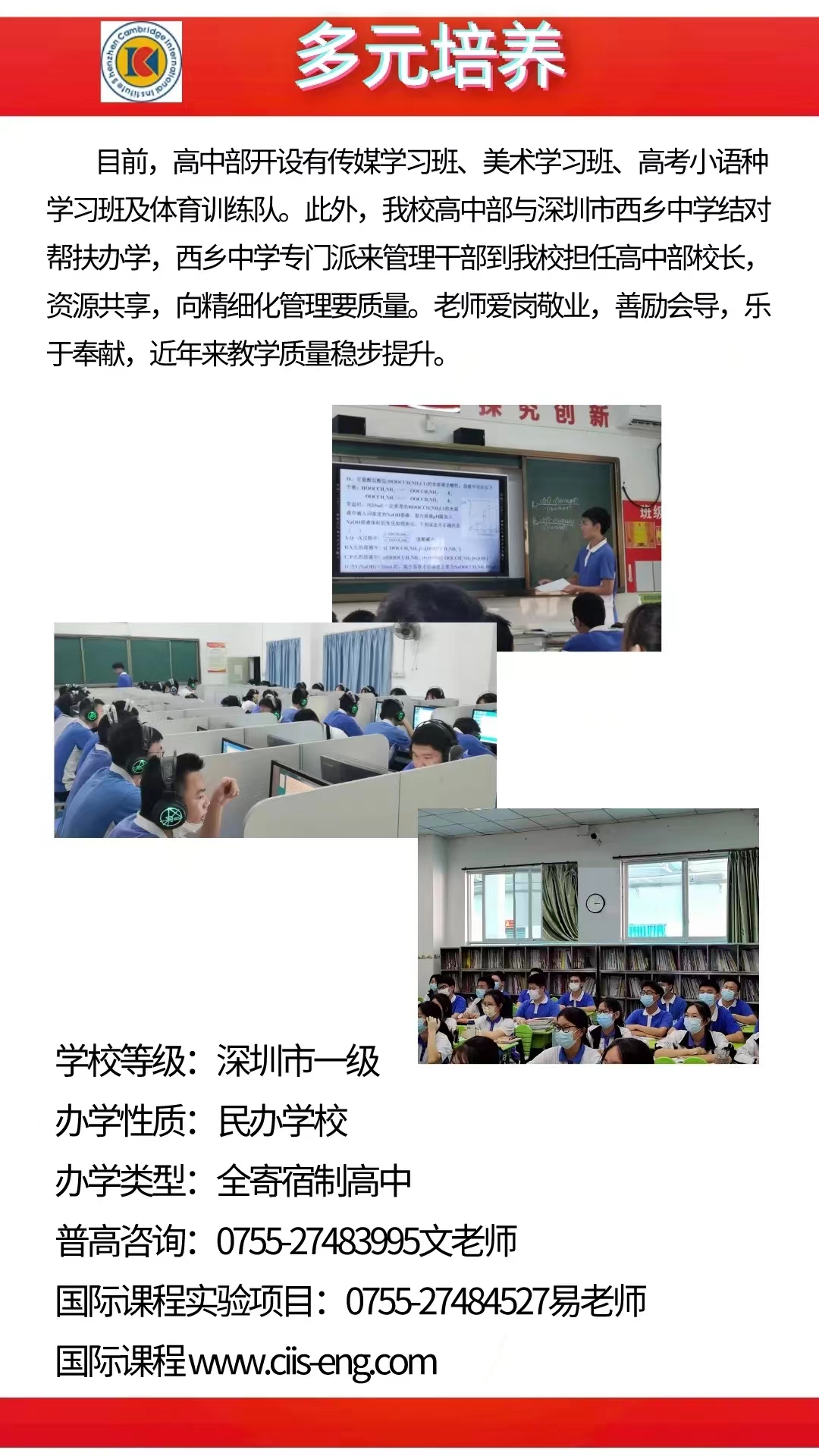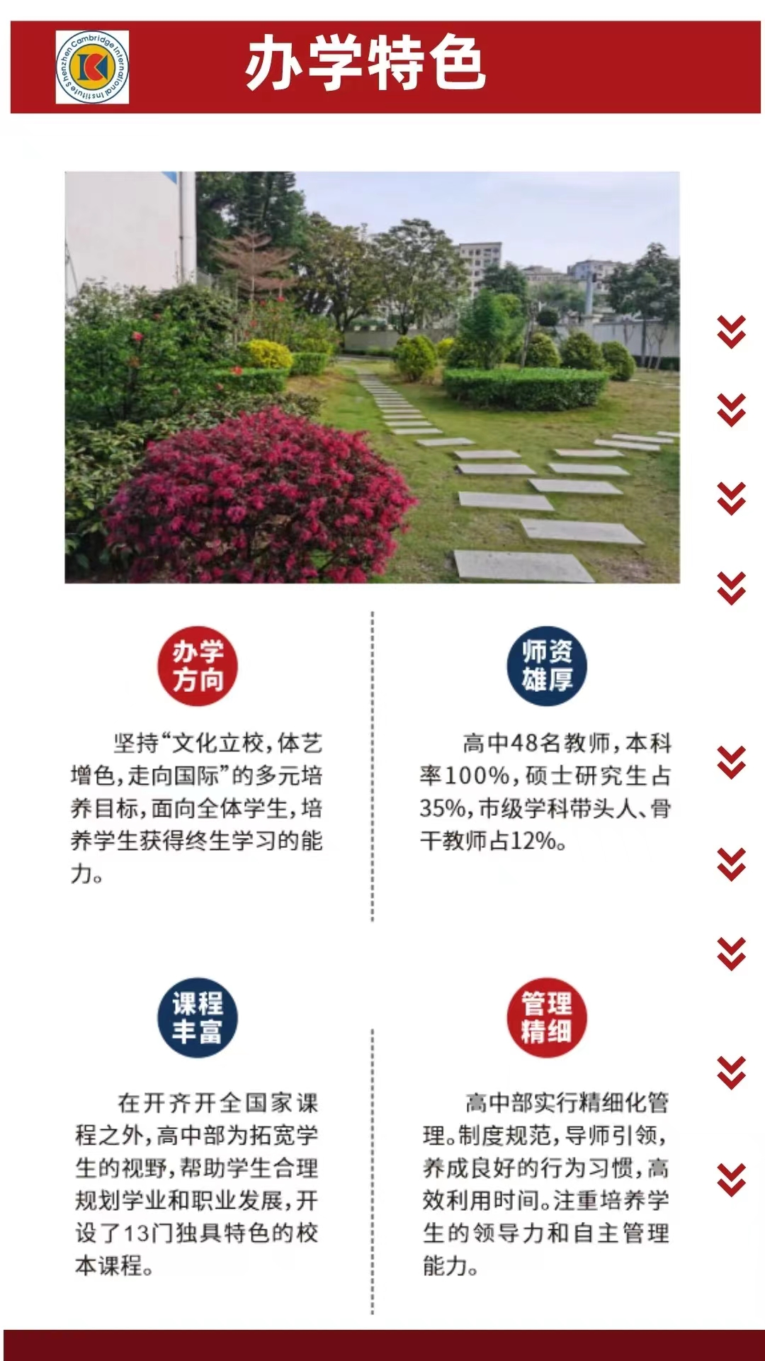 深圳市华侨(康桥)书院关注全体学生,践行让每一个学生都得到充分发展的教育理念,实行分层教学,为学生提供丰富的校本课程,培养学生的兴趣、挖掘自身潜能。